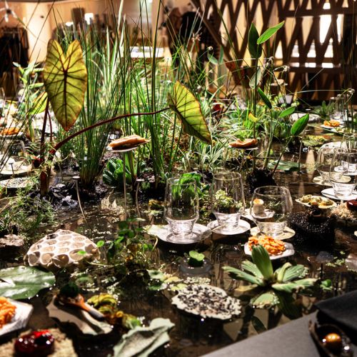 Notre équipe a réalisé le chemin de table transformé en un véritable petit lac. L’eau recouvre la surface et met en scène les ingrédients : des plats reposent sur des rochers, des nénuphars et des feuilles, créant ainsi un décor à la fois raffiné et original, invitant les convives à un voyage immersif autour d’un étang.